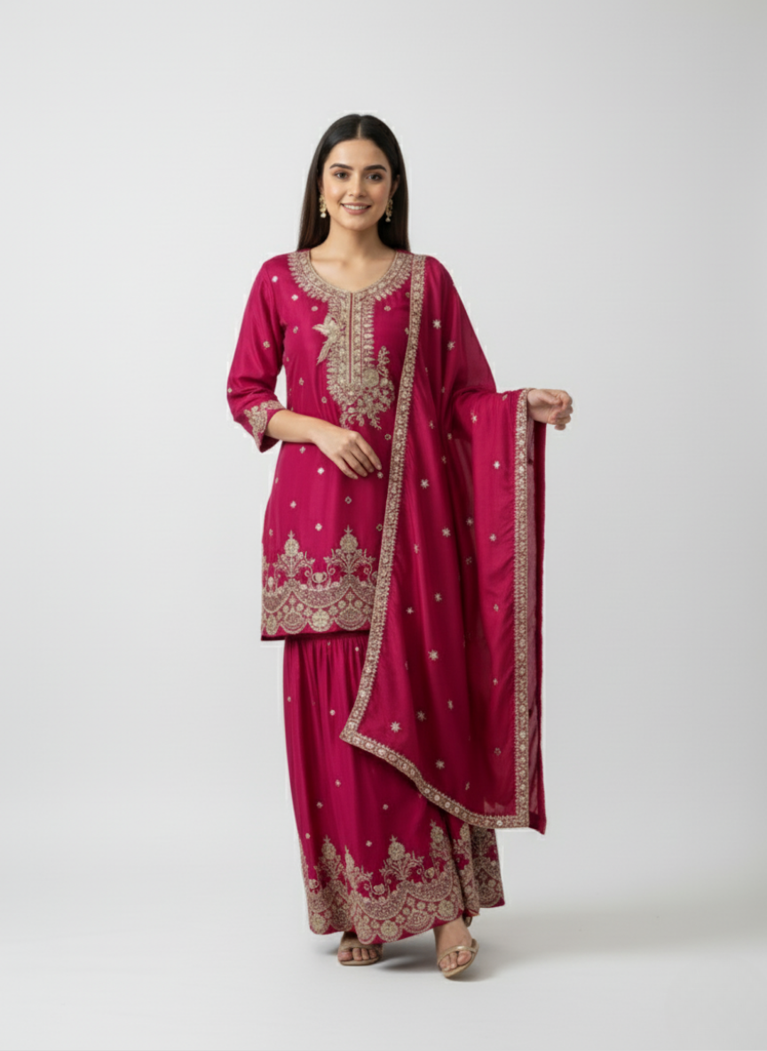 Description | Fashion-forward casual wear, this outfit | Chikankari Embroidery Cotton Rayon with Pant | Women Pure Cotton Kurta Palazzo Dupatta Set | |||||||||||||||||||||||||||||||||
