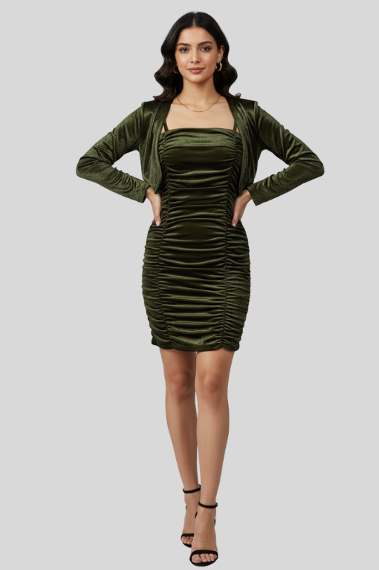 Style | Bodycon, Ruched Detailing with Layered Shrug |