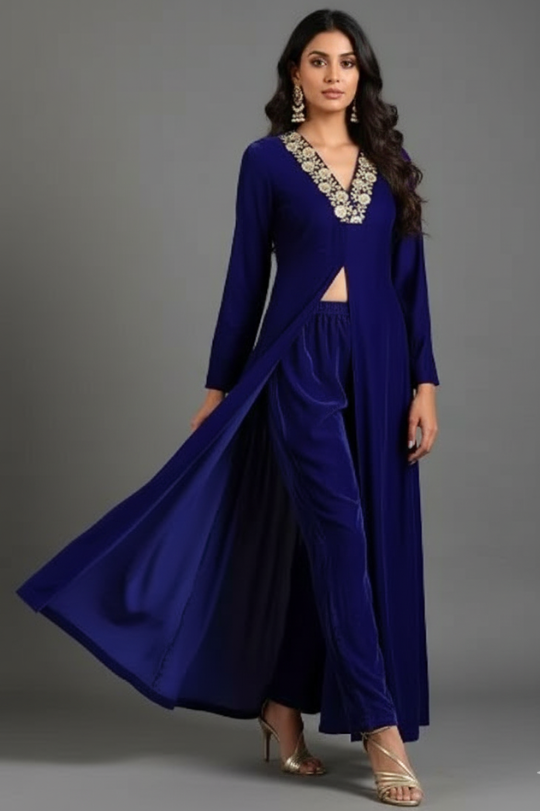 New Winter Velvet Suit Set with Embroidered Neckline & Front Slit