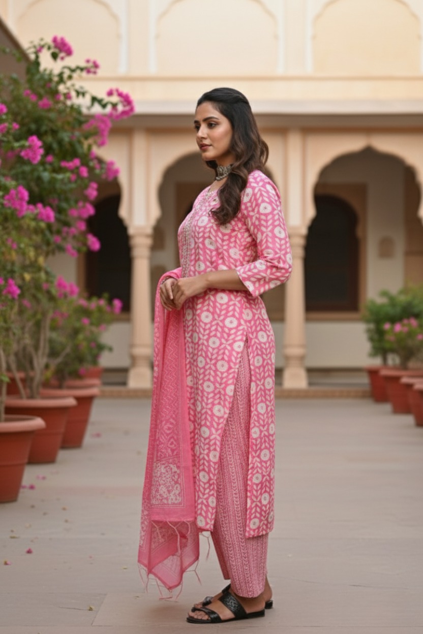 The Pure Cotton Kurta Pant Dupatta Set adapts seamlessly to different occasions. Pair it with minimal accessories for a subtle, elegant appearance, or add bold jewellery for a more festive vibe. K & P Fashion has crafted this set to be versatile, offering multiple styling possibilities that suit your personal taste and the event at hand.