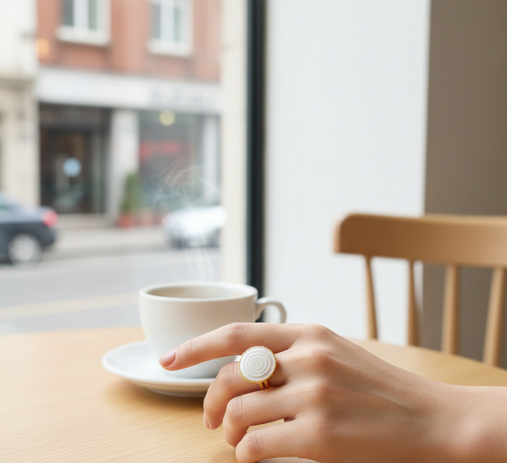DescriptionThe ring features a round white textured stone design with subtle diamond detailing, framed in a gold-tone stainless steel base that ensures long-lasting color retention.