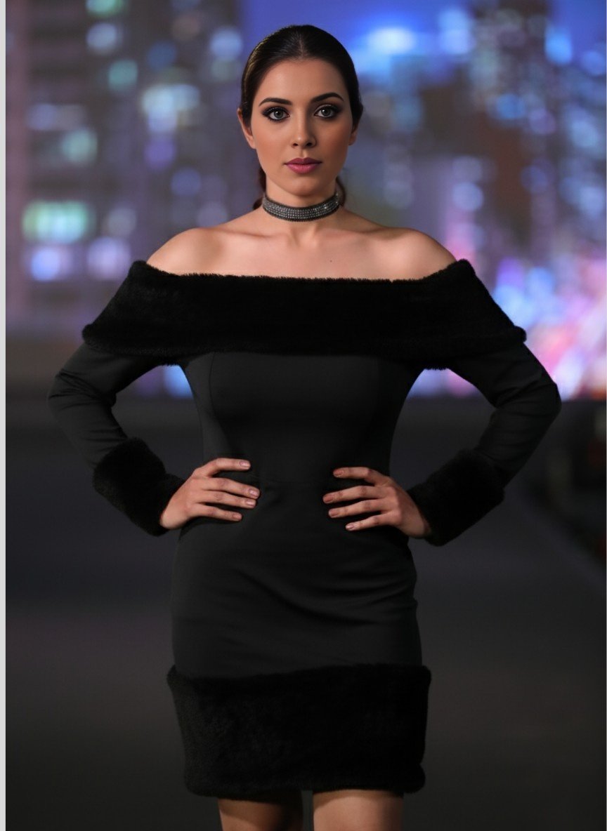 Velvet Charm Off-Shoulder Faux Fur Trim Mini Dress