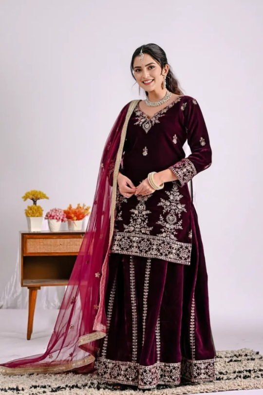 Velvet Top with Sharara Palazzo & Dupatta Set – Luxury Winter Edition